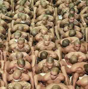 En la fotografía se observan cientos de presos (todos hombres) sentados en el piso, uno detrás de otro, con las piernas abrazando a quien tienen delante, manos amarradas por detrás de la espalda, torsos desnudos, cabezas rapadas, tatuajes en la cara, en el torso, en los brazos, en las piernas, algunos usan cubrebocas, todos se rozan en un gesto de absoluta privación de la individualidad.