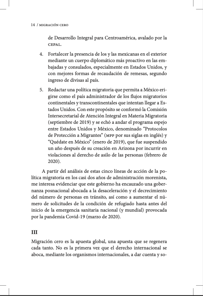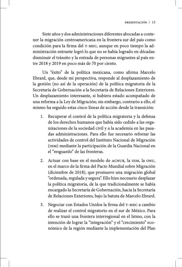 La política migratoria de este sexenio, encabezada por el canciller Marcelo Ebrard, ha favorecido la migración mexicana hacia Estados Unidos, impidiendo la migración de personas con otras nacionalidades. Este proyecto de política migratoria, para mí, forma parte de la gobernanza global desde el momento en que se firmó el Pacto Global de Migraciones en 2018. Análisis que realizo en mi libro Migración cero. Reterritorializar la condición de refugiado en México.